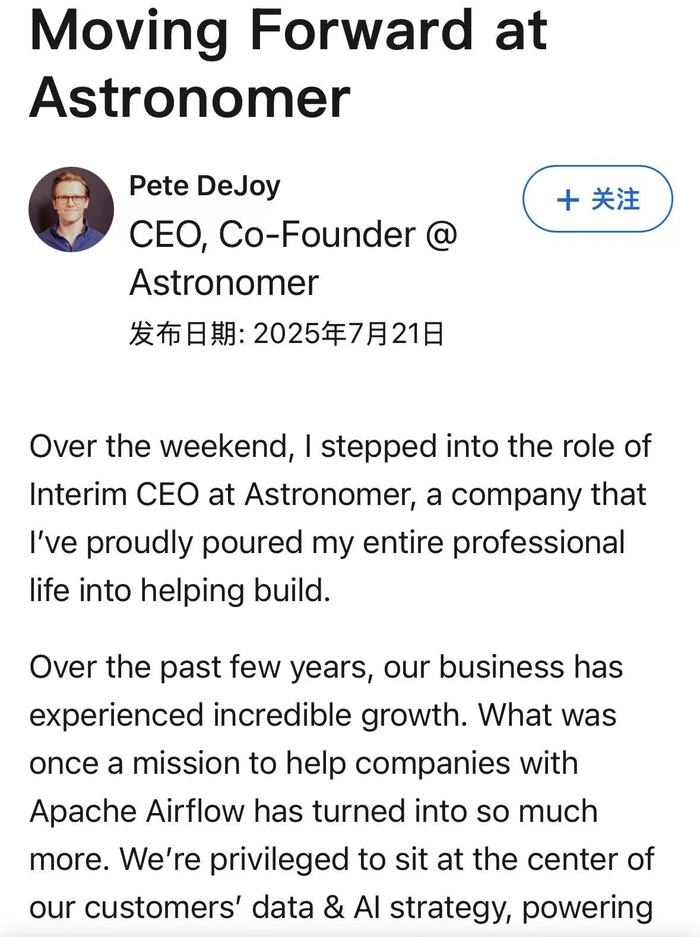 德乔伊7月21日在领英上发帖,题为“Moving Forward at Astronomer”(在“天文学家”继续向前)。他写道:“过去几天的事件所获得的媒体关注度,是很少有公司会遇到的,更不用说我们这个数据和 AI 世界小角落里的创业公司。这种聚光灯下的关注对我们的团队而言,是不寻常、超现实的,Astronomer的名字现在家喻户晓,虽然我绝不希望它以这种方式发生。”